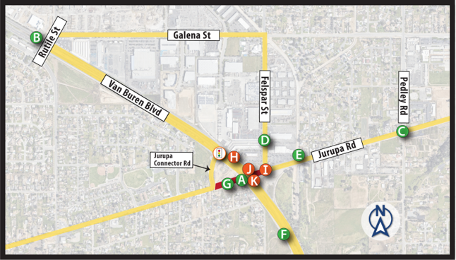 This project will construct a new, four-lane underpass on Jurupa Road under Van Buren Boulevard and the Union Pacific Railroad bridge. The underpass will improve safety and traffic circulation by separating train traffic from vehicles, pedestrians and cyclists. It will also improve the quality of life for Jurupa Valley residents by eliminating waiting for trains, train whistles and pollution from idling vehicles.